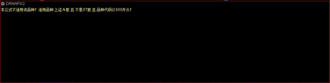 DRAWTEXT_FIX(NOT(BE显示),0,0,0,'本公式不适用该品种!适用品种:上证A股 且 不是ST股 且 品种代码以600开头!'),COLORYELLOW;