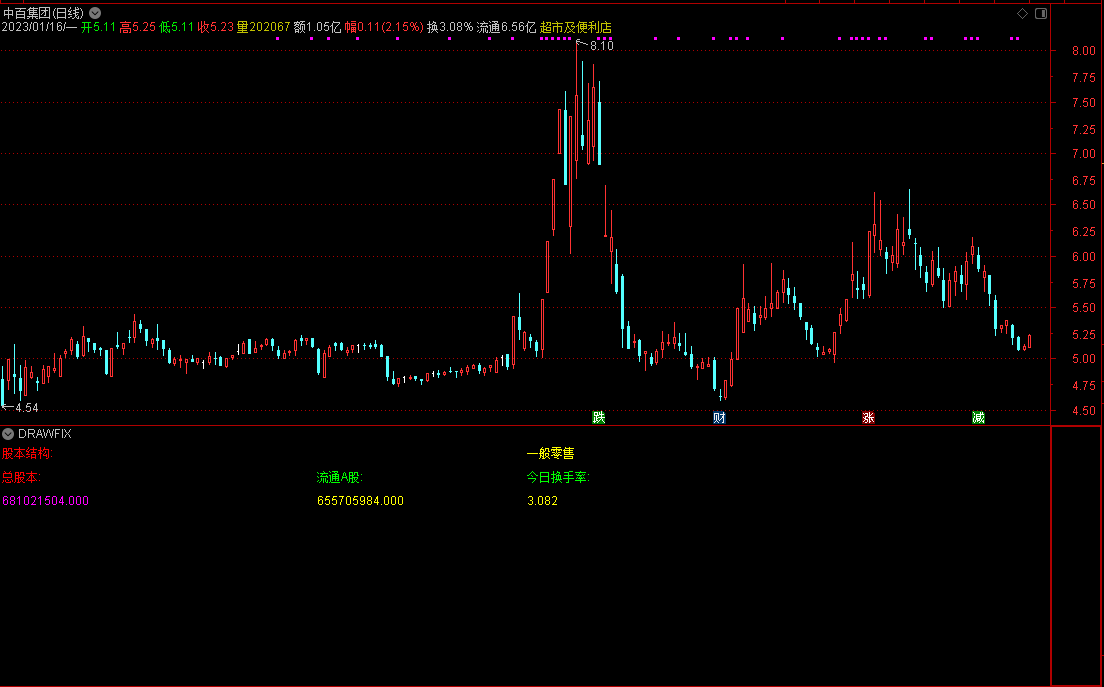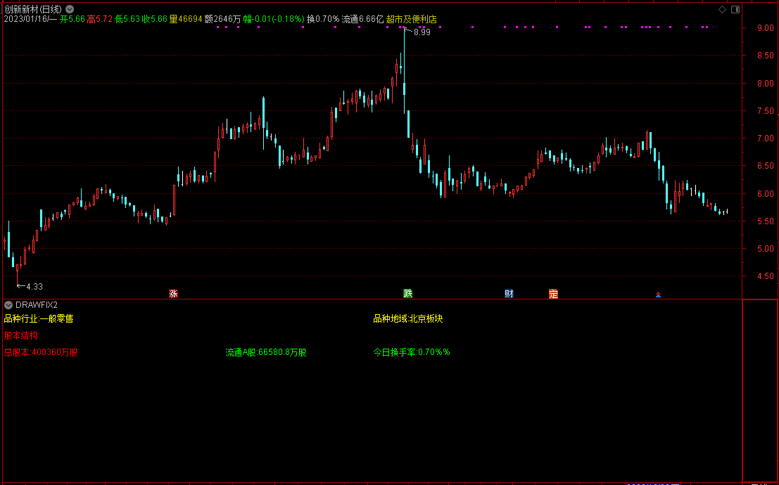 DRAWTEXT_FIX(ISLASTBAR,0.3,0.1,0,'流通A股:'),COLORGREEN;