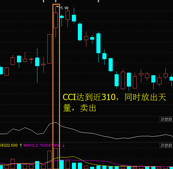 补充说明:此外,即使CCI指标尚未达到300,但只要股价处于历史高位区域,并伴随成交量放出巨量,同样可以视为顶部信号,应考虑卖出。这本质上是“高位放量”这一经典量价形态的应用,其有效性同样不容忽视。