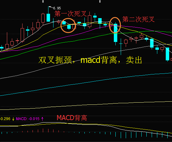 形态核心:股价经过一轮上涨后,5日均线与10日均线在短时间内(通常指一个下跌波段中)连续两次形成死叉。第一次死叉可能只是短暂的回调,但随后股价反弹无力,再次出现死叉,这便构成了“双叉扼颈”形态。