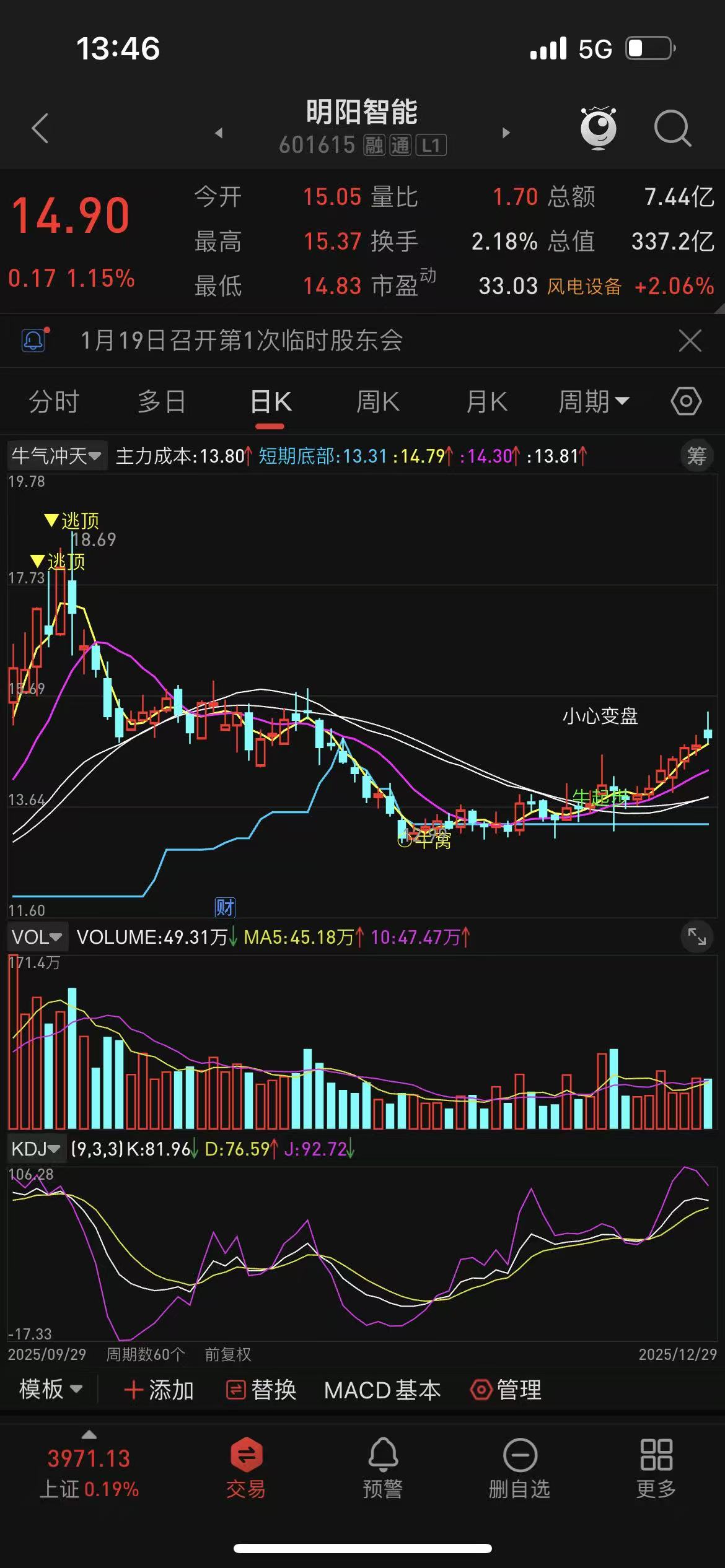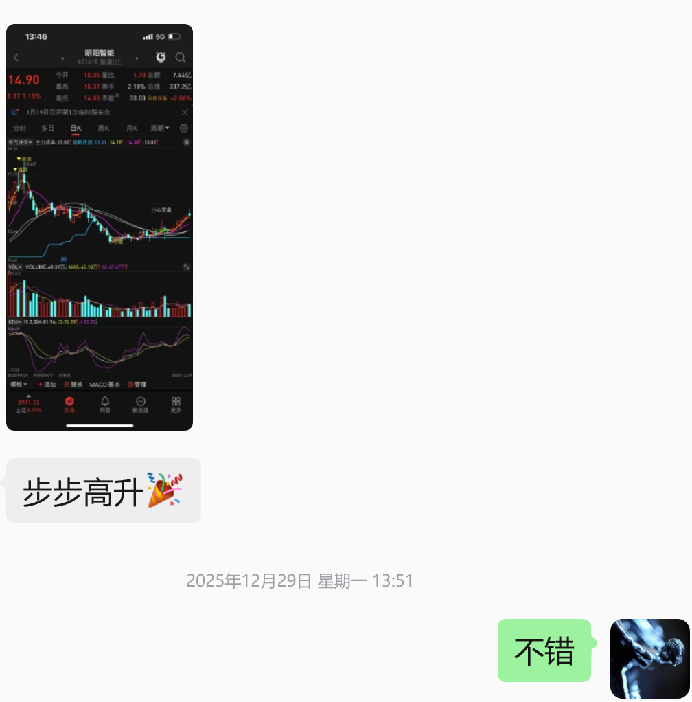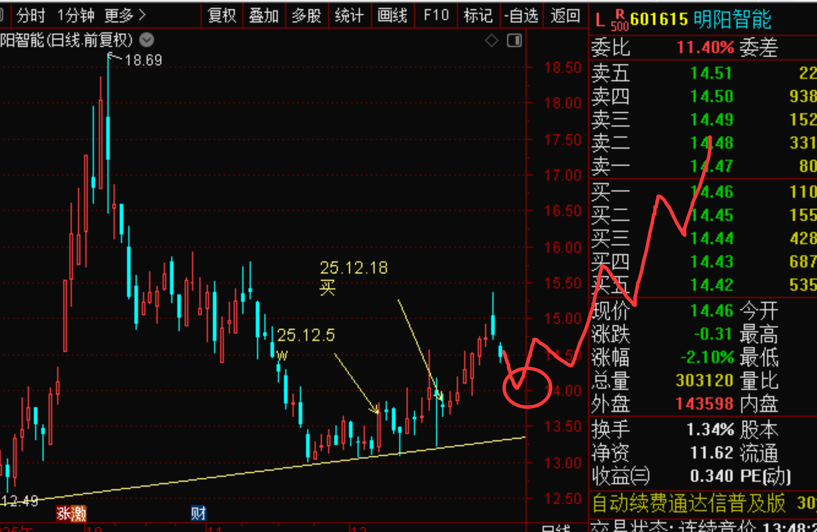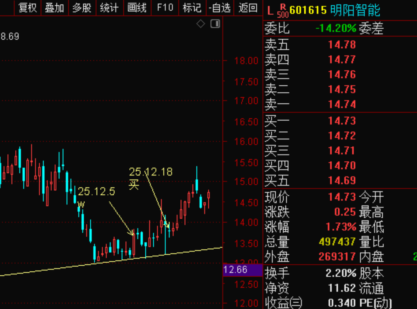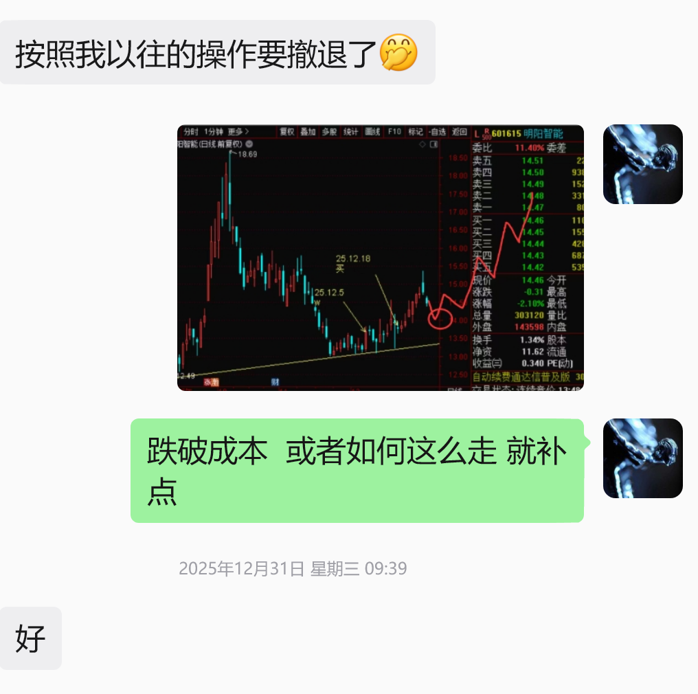 25年12月29号,学员朋友看到明阳智能可能要见短顶,想减仓后回调再买入.