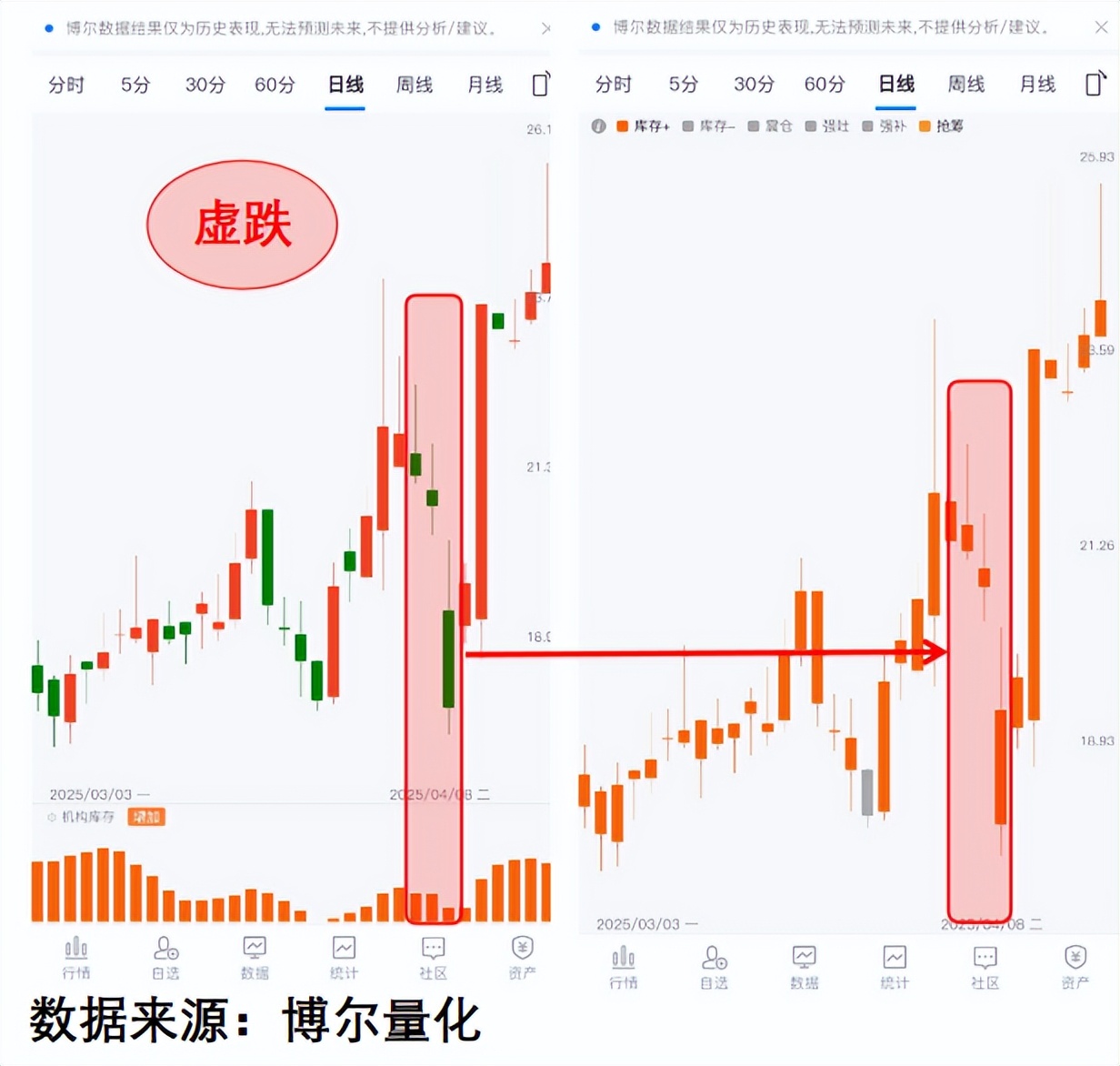 看行为图就很清晰了,虽然红色框部分出现大幅下跌,但机构资金一直是积极参与交易的状态,这样的下跌就是虚跌。