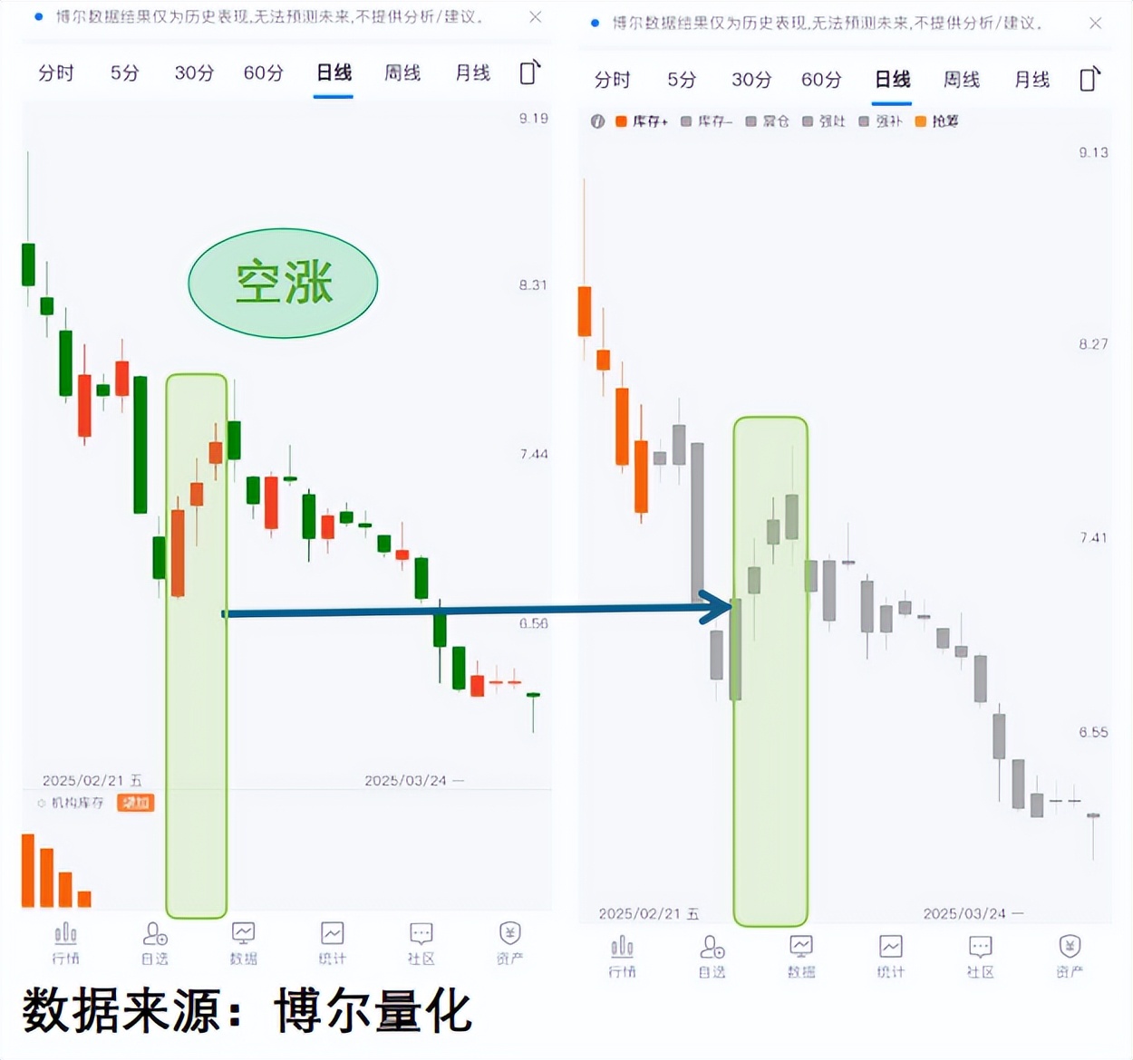 大家注意看图片底部的橙色柱体,它是「机构库存」数据,是我用了十多年的大数据系统特有的,表达机构资金参与交易的意愿,将这一数据叠加到走势上就是右侧呈现出的样子。