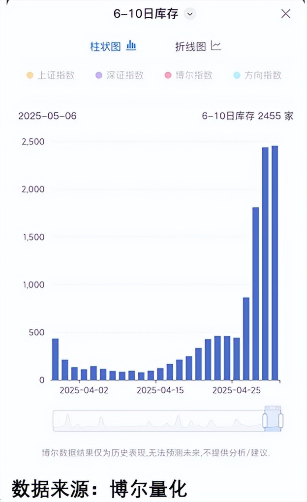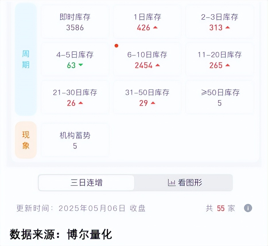 从图中可以清楚看出,目前市场上连续多天有机构资金参与的个股将近3000家,还有一个数据需要大家留意,目前6-10日库存数据不仅大幅增加,而且已经创近一月新高。