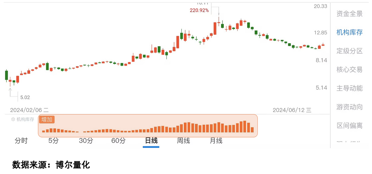 「机构库存」数据几乎和行情同步持续,股价也翻了两倍多。这才是我们该找的标的。但问题是,没有量化工具,普通散户怎么看得出来?