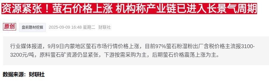 最近内蒙地区的萤石价格涨得那叫一个欢实,97%萤石粉湿粉出厂价已经飙到3100-3200元/吨。看着这张价格走势图,多少人眼睛都绿了。