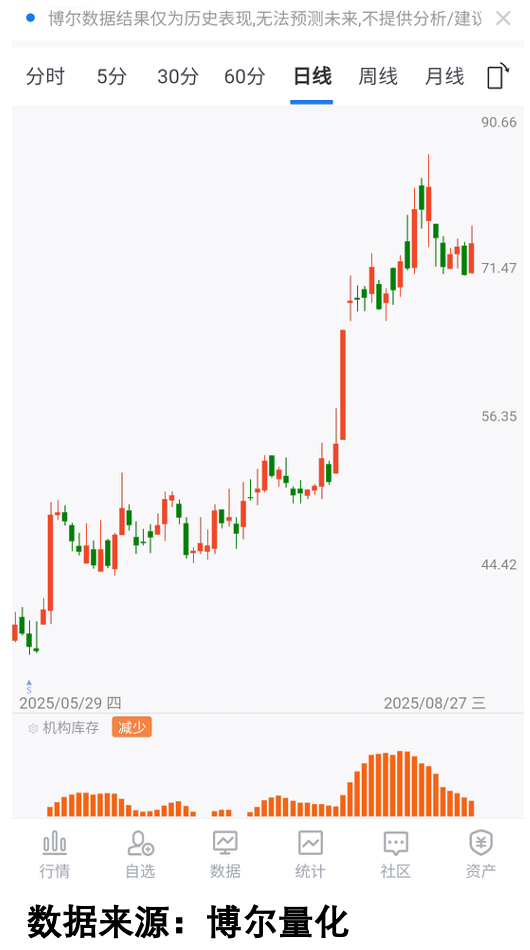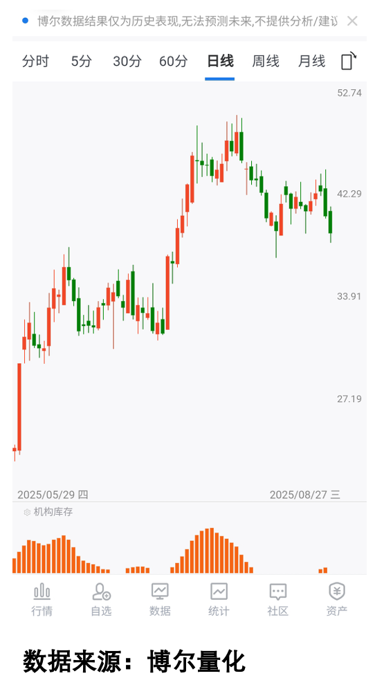 进入7月中旬后,「益方生物」的「机构库存」数据明显不活跃了。这说明虽然基金持仓还在那里放着,但他们已经不怎么参与交易了。