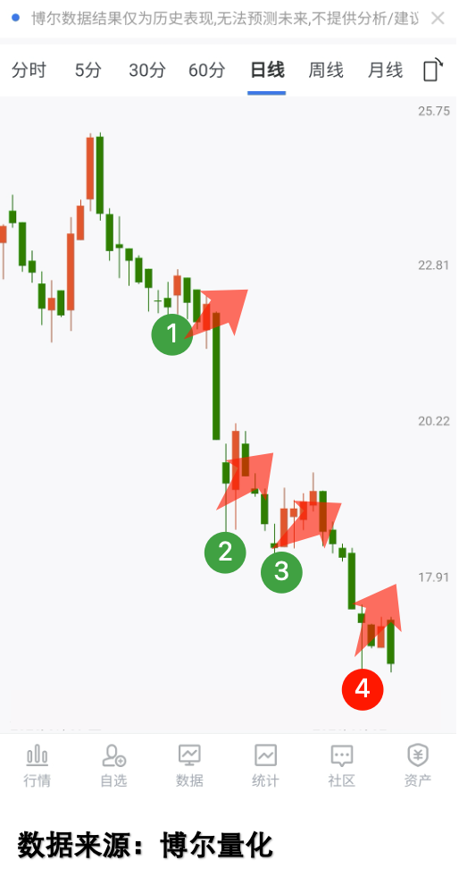 再看另一个极端案例——华培动力。这支股票在同期表现糟糕,一路下跌。很多人觉得"跌多了总会反弹",于是不断抄底。