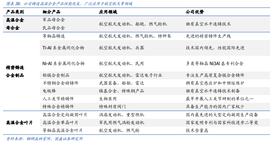 在铸造高温合金领域,公司掌握着热控凝固、细晶工艺以及真空离心等多项先进制造技术,拥有完整的铸造高温合金生产线,铸造类产品覆盖范围广,是国内该领域生产规模最大的供应商。