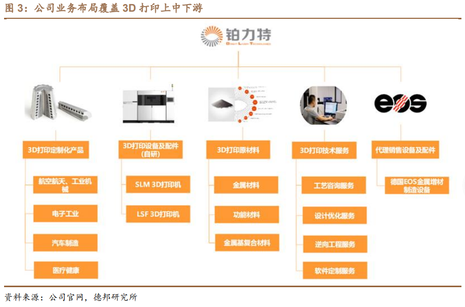 国内3D打印、金属增材制造龙头,主营业务覆盖至3D打印上游原材料制备、中游设备研发、下游产品打印及后处理的纵向全产业链,产品可广泛应用于航空航天、机械、电子、轨道交通、汽车、医疗模具等行业。