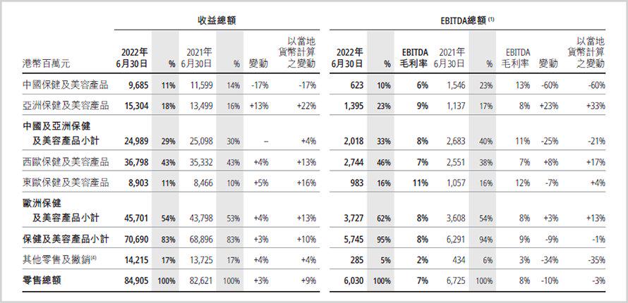 大盘明显下滑,屈臣氏难以幸免。8月4日,屈臣氏母公司长江和记发布2022上半年财报,受上半年综合因素影响,屈臣氏中国市场销售额为96.85亿港币(约合人民币83.34亿元),同比下降17%,同比店铺销售额下降17.6%。但值得关注的是,屈臣氏上半年仍然录得息税前利润6.23亿港元(约合人民币5.36亿元),在重压之下仍然保持了盈利,是为数不多上半年没有录得亏损的零售商之一。