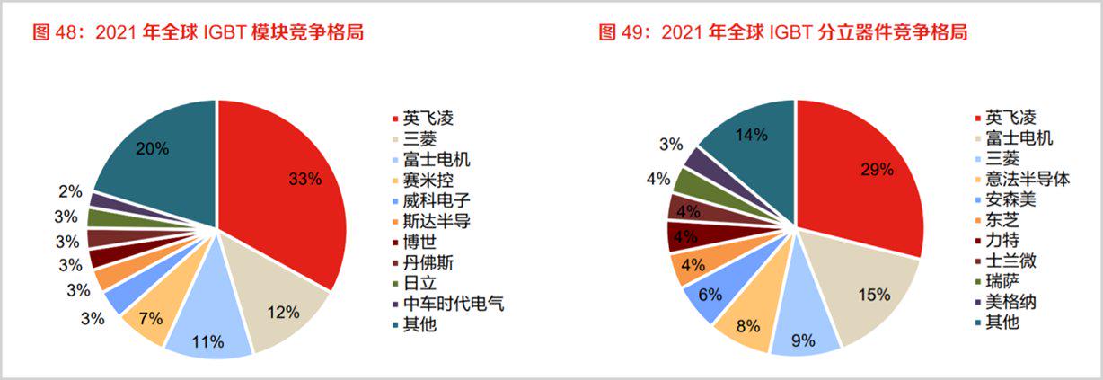 从全球竞争格局看,据东方证券数据,2021年全球IGBT模块前五大厂商占据了67%的市场份额,其中英飞凌占比达33%,国内的斯达半导和时代电气分别仅为3%和2%;在整体分立器件上,英飞凌同样稳居榜首,士兰微则占4%排在第八。