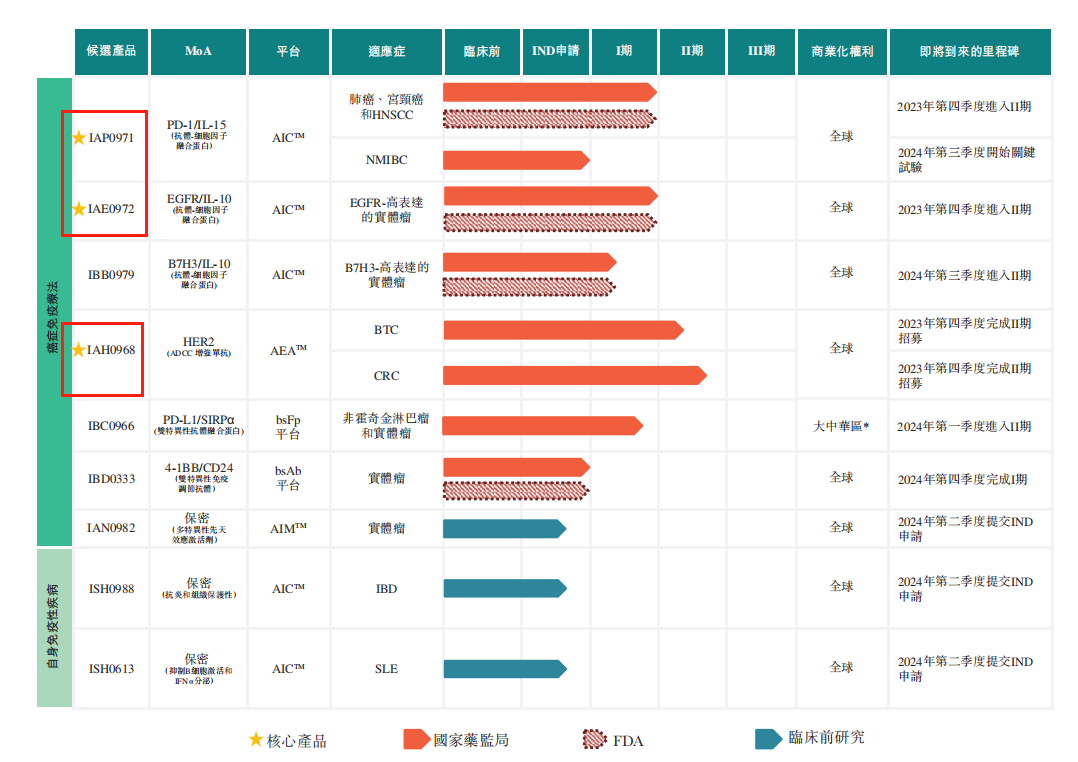 招股说明书显示,盛禾生物目前共有9个产品管线,其中6个产品进入了临床阶段,6个产品中,IAP0971、IAE0972及IAH0968是盛禾生物的核心产品,其中IAP0971和IAE0972为抗体细胞因子,具有抗肿瘤活性;IAH0968是一种抗体依赖性细胞介导的细胞毒性增强mAb。