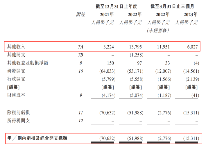 2021年、2022年和2023年1-3月,公司未有主营业务收入,仅通过政府补助、银行利息等非主营途径有322.4万元、1379.5万元和602.7万元的其他收入。而同期,公司的净亏损分别为7063.2万元、5198.8万元及1531.1万元(预计全年6124.4万元,1531.1*4),亏损整体处在一个相对稳定但数额不小的状态下。