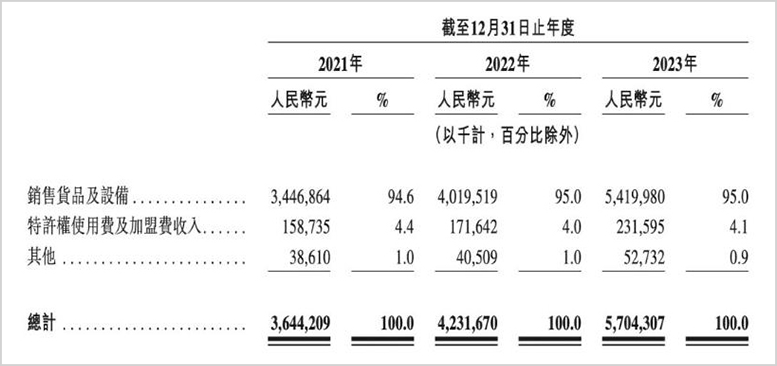 2021-2023年,茶百道货品及设备销售实现营收34.47亿、40.20亿、54.2亿,占比分别94.6%、95%、95%;特许权使用费及加盟费收入分别为1.59亿、1.72亿、2.32亿,占比分别为4.4%、4.0%、4.1%。