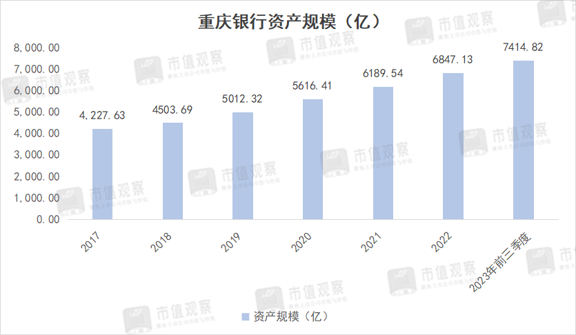 林军在任期间,重庆银行的资产规模增长较快,由当年的4227.63亿增长到2022年的6847.13亿,增长幅度超过了60%,到2023年前三季度进一步增长至7414.82亿,并成为了西部首家A+H股上市城商行。