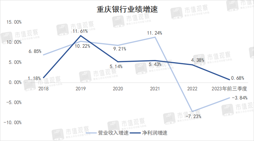 站在营业收入的角度,在2018年至2021年间,增速仅10%左右,在2021年行业回暖之际,增速也只有11.24%,明显低于城商行龙头江苏银行的22.58%和宁波银行的28.37%增速。自2021年以后,重庆银行增速便快速降低到负值。