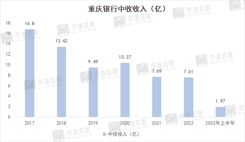 透过财报可以看出,2017年后重庆银行的中收收入逐年下滑,当年还在16.8亿,到了2022年就腰斩到了7.61亿。2023年上半年为1.97亿,同比再次下降了52.35%。