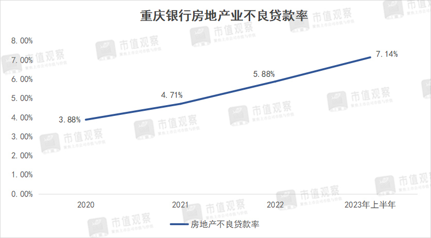 尽管当下重庆银行房地产业务的贷款占比已经不高,2023年上半年仅2.66%,但不良率已经超过了7%,位居城商行首位,严重拖累了公司整体的资产质量。