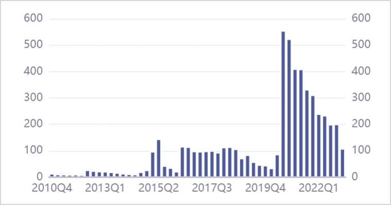 主动权益类基金业绩表现糟糕,以致于该类型基金规模增加不多。其中,混合型基金规模从2019年一季度的304亿元大增至2021年四季度的1608亿元,后持续回落至2023年四季度的861亿元。股票型基金则保持小幅增长态势,但2023年仅有732.9亿元。