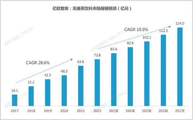 尼尔森IQ数据显示,2023年无糖茶饮市场增速迅猛,同比大涨110%;亿欧智库预计,2025年中国无糖茶市场规模将突破百亿,短短两年后更有望达到124亿。