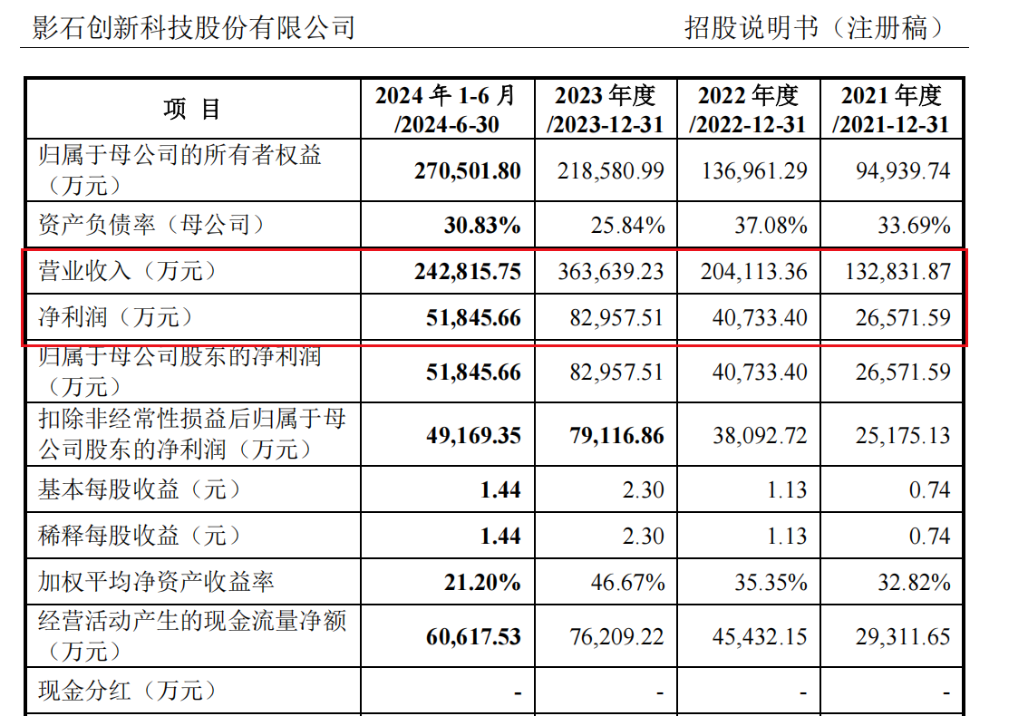 根据Frost & Sullivan的数据,2023年,在全景相机领域,影石创新排名全球第一,在全球市场中占有率达到67.2%;在运动相机领域,公司也取得了全球第二的好成绩。从招股书可以看到,2021年至2024年6月底,公司整体的营收分别为13.28亿元、20.41亿元、36.36亿元和24.28亿元,整体的年复合增长率达到了65.46%,对应的净利润分别为2.7亿元、4.07亿元、8.3亿元和5.18亿元。