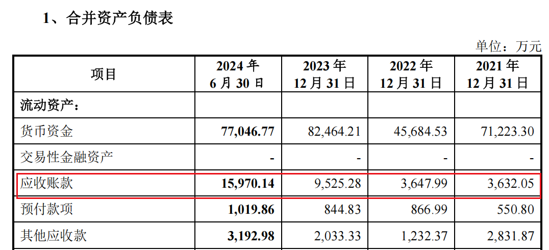 而且在合并报表中,公司的应收账款余额在2023年和2024年出现了大幅增加,2023年应收账款余额为0.95亿元,同比增加164%,而2024年上半年又在2023年的基础上增加了68%。应收账款的增长速度远超过了营收增长速度。