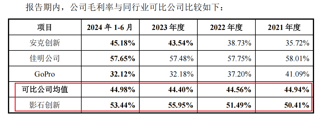 整个报告期内,影石创新的毛利率分别为50.41%、51.49%、55.95%和53.44%,一直维持在超50%的高位上,较行业可比公司平均高出近10个百分点。