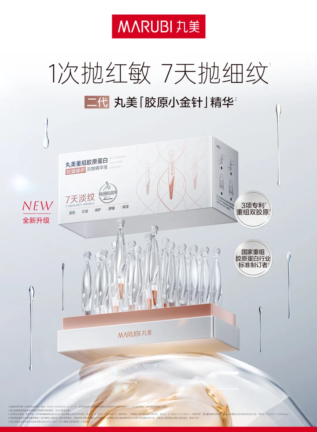 2024年,丸美推出弹弹弹次抛精华液,是其王牌产品弹力蛋白系列重磅升级,以尖端科学技术为重要推手,在实现更强功效的弹力蛋白活性成分高效透皮吸收上取得重大突破,以更健全的弹力蛋白抗衰解决方案,为渠道商带来极具竞争力的产品。