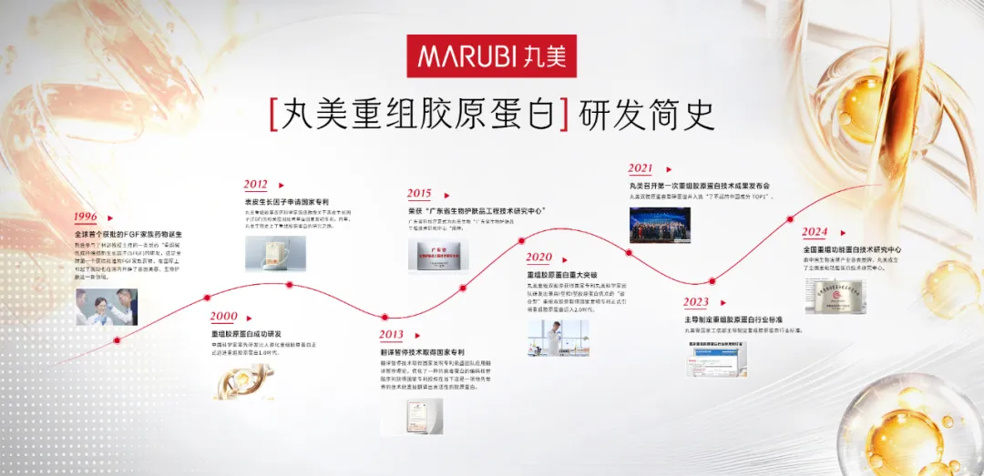 作为中国重组胶原蛋白护肤应用的“吹哨人”,丸美通过长达20余年的研究,2021年率先推出了“100%与人同源、高活性、高稳定”的重组人源化胶原蛋白,应用于产品中。这一核心科研成果的应用,让重组胶原蛋白成为与玻色因、胜肽、A醇分庭抗礼的“中国芯”。