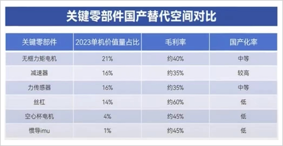 在产业链中,减速器、伺服系统、控制器占据70%的成本。进一步拆分看,主要包括丝杠、力矩传感器、无框/空心杯电机、谐波/行星减速器及操作系统等。