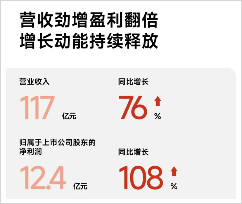 财报显示,今年上半年九号公司实现营收117.42亿元,同比大增76.14%,归母净利润12.42亿元,同比大增108.45%。