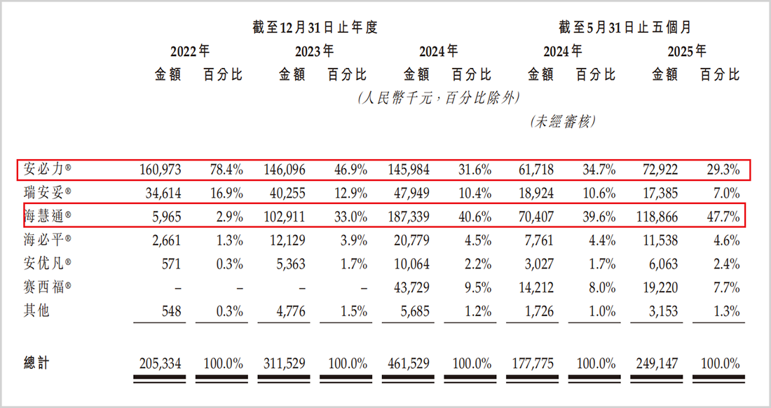 海西新药的业务结构凸显出其对仿制药的过度依赖。高达98%的营收来源于仿制药,而创新药管线尚未产生收入。四大主力产品安必力®、海慧通®、瑞安妥®和赛西福®构成了2024年85%的收入来源,其中海慧通®在2025年前五个月单产品贡献了47.7%的营收。产品结构看似稳固,实则任一产品的市场波动都可能显著冲击公司业绩。