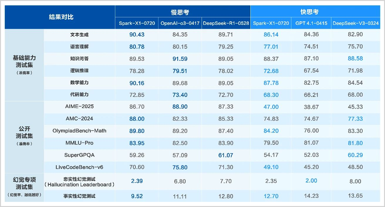 今年以来,讯飞星火继续快速迭代,从V4.0 Turbo到讯飞星火X1,并分别在4月和7月两次升级。讯飞星火X1升级版性能全面对标DeepSeek-R1 528版本、OpenAI o3,并在幻觉治理方面取得显著进步,有效解决大模型“一本正经胡说八道”的通病。