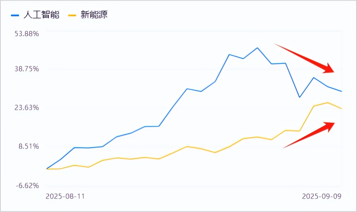 AI板块中的光模块指数自9月初(截止9月9日)累计下跌17%。其中,明星抱团股“易中天”重挫20%左右。反观新能源板块,固态电池、储能两大细分指数均涨逾10%,阳光电源、先导智能、亿纬锂能等龙头股价一度飙升逾40%。