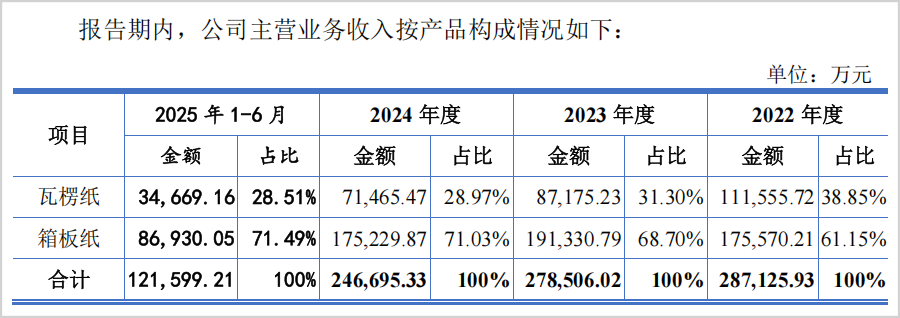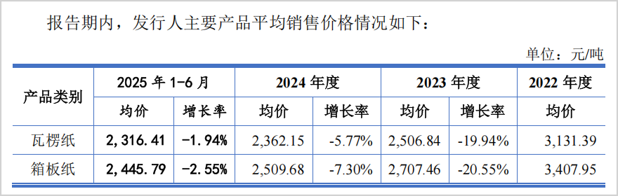 据招股书显示,自2022年以来其箱板纸销售单价持续下滑,从当年的3407.95元/吨下降到2025年上半年的2445.79元/吨,下降幅度达28.23%。