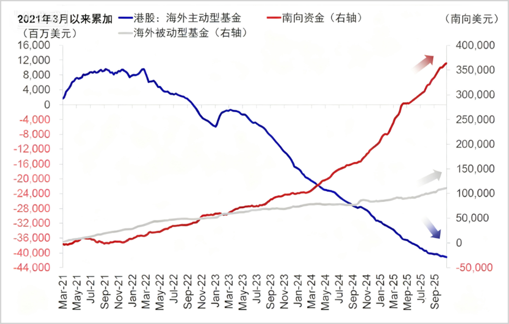 截至2025年第三季度,被动型公募占南下资金存量的比例已达9.2%,首次超越主动型公募的9.1%,完成了历史性跨越。相比之下,A股市场出现这一结构变化是在2024年第三季度。