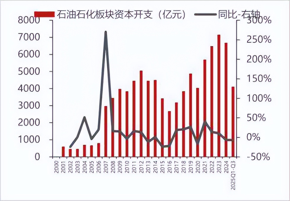 2025年前三季度,石油石化、基础化工板块的资本支出增速分别为-6.8%、-8.6%,2024年全年已同比下滑6.6%、15%。相比之下,2022-2023年因全球供应链扰动,资本支出曾连续两年实现双位数高增长。
