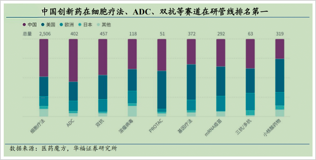 根据华福证券的最新统计,截至2025年中国在细胞疗法、ADC、双抗、基因疗法、溶瘤病毒、三抗/多抗等技术赛道的在研项目已经处于全面领先地位,实力完全不输美国。