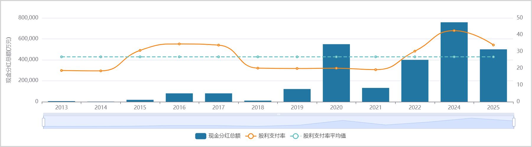 事实上,牧原股份在最近几年确实加大了分红。据Wind统计,2014年上市以来,牧原股份累计分红13次,分红金额高达265.8亿元,平均分红率为30.9%。但从2024年开始,股利支付率超过40%。2025年上半年,更是分红了50亿元,占净利润的近一半。