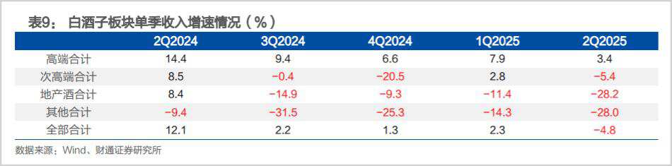 在行业调整期,不同定位的品牌酒企收入也呈现出较大差异性。据财通证券研究,自2024年第二季度至2025年二季度高端白酒的单季度收入虽然有所下降,但始终维持在正值,表现较为稳定。