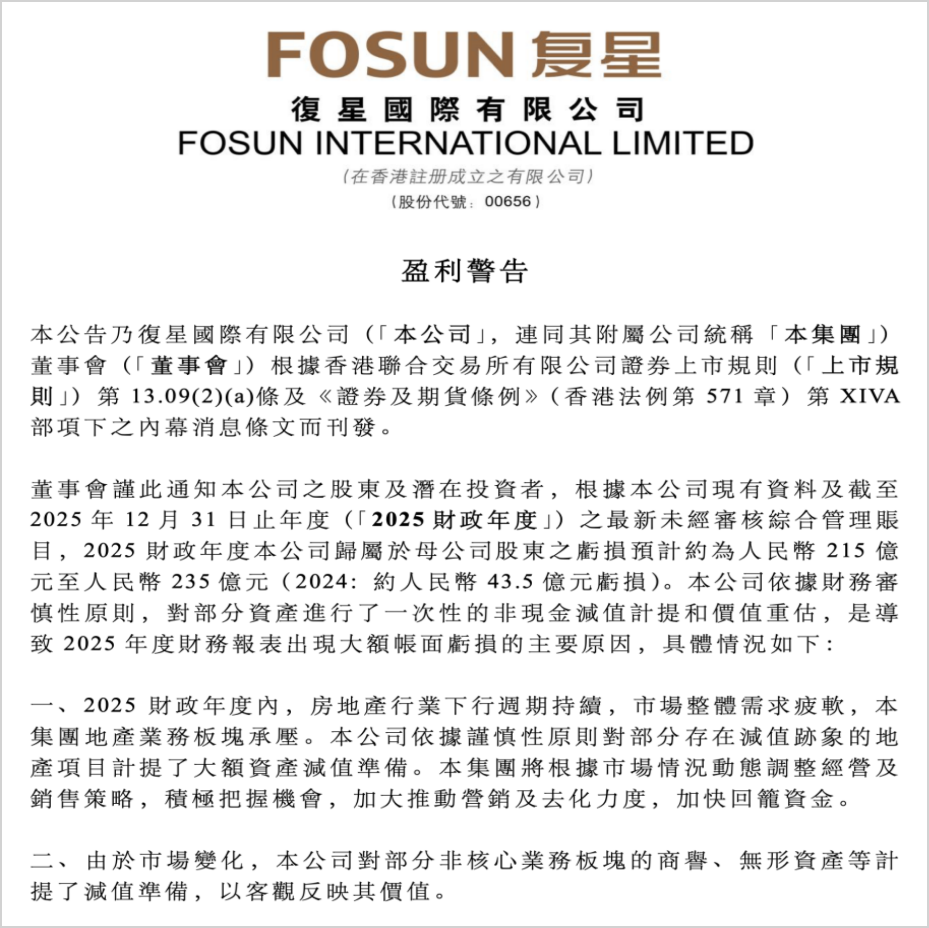 而回到业绩本身,2025年复星国际预计亏损215至235亿元,这让不了解情况的投资者大吃一惊,但对于长期关注复星的投资人来说,应该会长舒一口气:因其亏损并非经营业务所致,而是因为对历史包袱地产和非主业的资产减值。