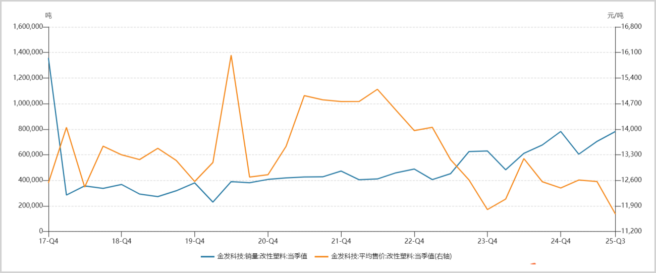 ▲金发科技改性塑料当季销量VS均价,来源:Wind