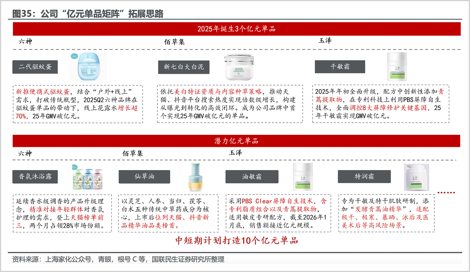 除已经跑出来了的三大亿元单品外,上海家化亦有多个新品展现出冲击亿元单品的势能。六神清爽香氛沐浴露、玉泽油敏霜(第二代)、玉泽特润霜、佰草集仙草油等都将成为“亿元单品”的潜力选手,印证公司大单品策略的可复制性以及日益成熟的爆品孵化能力。