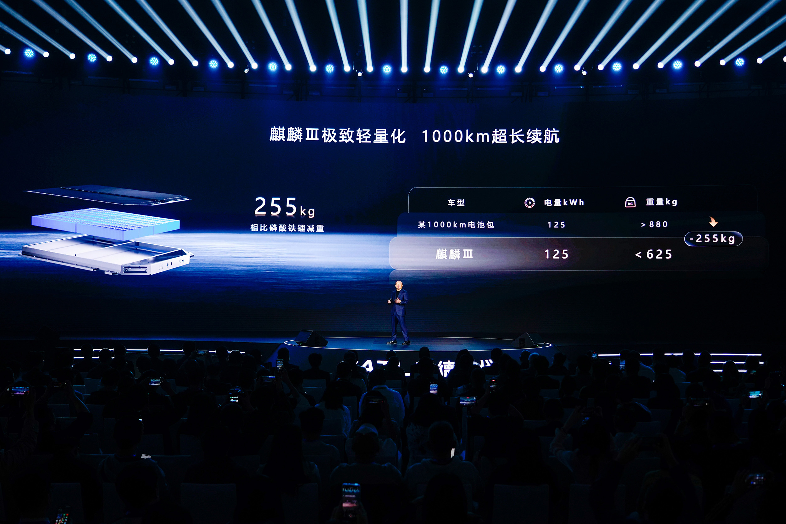 第三代麒麟电池的电芯能量密度达280Wh/kg,在实现1000公里续航的同时标配10C超充,电池包重量控制在625kg,与市售同级别千公里续航磷酸铁锂车型相比,减重255kg,空间节省112L。