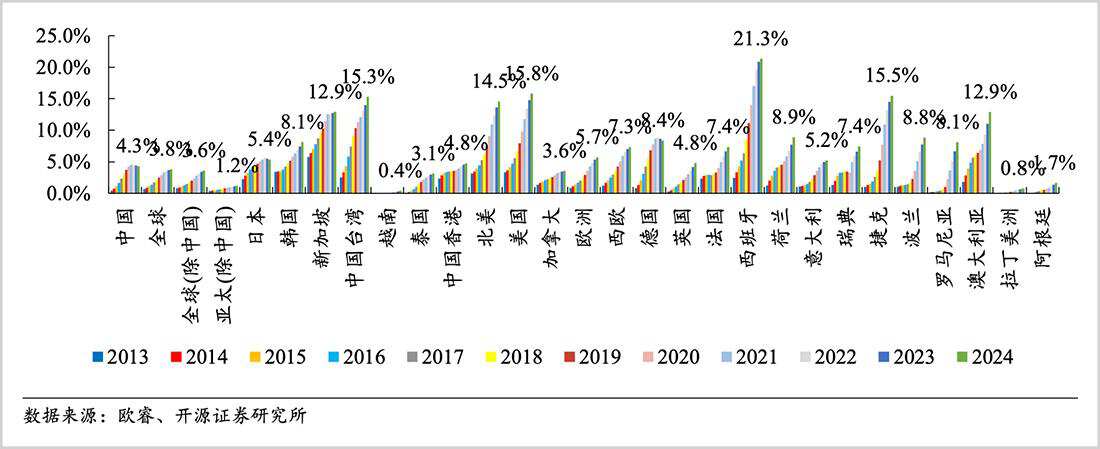 尽管受到国补政策催化,近两年国内扫地机器人迎来一波井喷,但根据开源证券测算,我国扫地机行业渗透率仅为4.9%(2025年)。而2024年,全球渗透率也仅有3.8%,欧洲地区5.7%,美国稍高一些,但也仅16%,行业尚处于早期阶段。