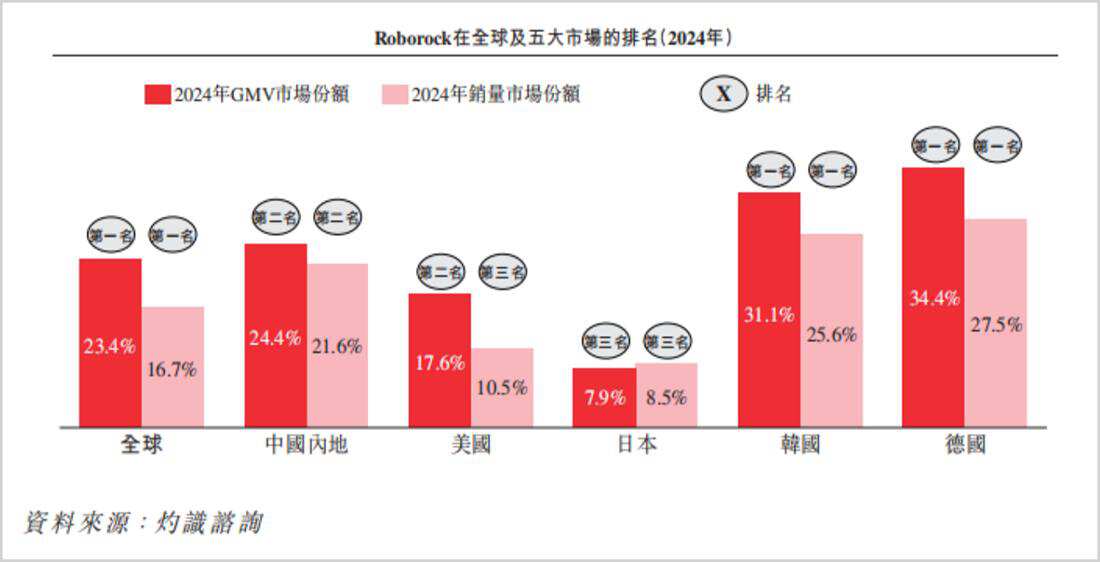 根据灼识咨询,2024年按GMV和销量统计,全球前五大品牌产品合计市场份额分别为73.1%和61.5%。其中,石头科技Roborock品牌GMV市场份额为23.4%,按销量计为16.6%,在全球智能扫地机器人行业中都位居头名。
