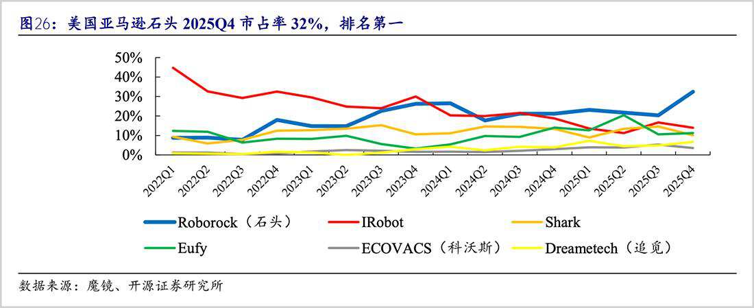 2025年,公司在核心市场继续高歌猛进。以美国为例,黑五期间,石头北美扫地机全渠道销量21万台,同比大增58%;线上渠道方面,在亚马逊劲增63%,市占率高达40%;线下渠道也不例外,扫地机KA渠道霸榜TOP3。