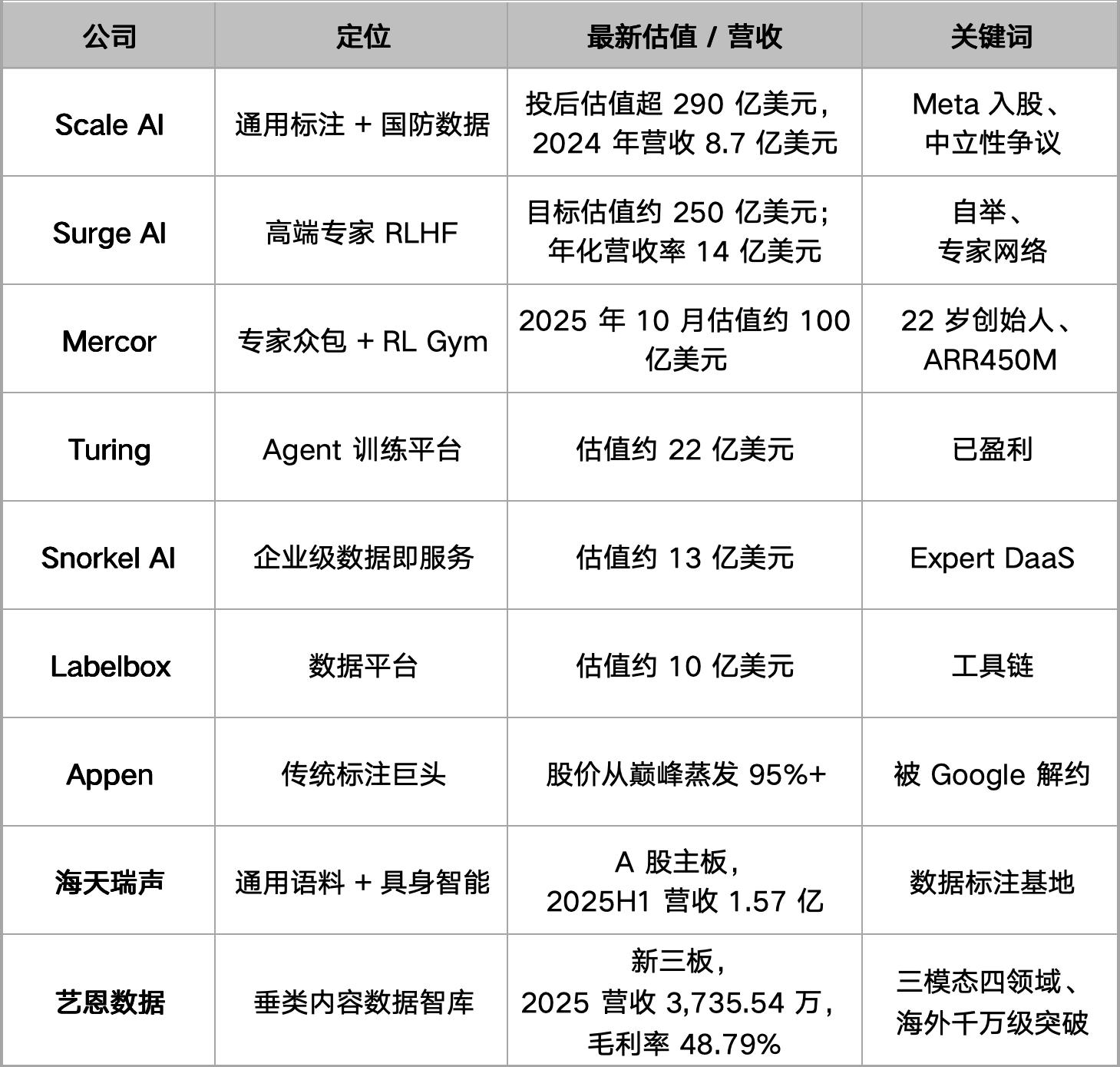 海外有Scale AI、Surge AI、Mercor、Labelbox、Snorkel AI、Turing、Invisible Tech等标志性企业;国内则有海天瑞声、云测数据、百度智能云数据众包、字节火山引擎数据服务、数据堂、星尘数据等。