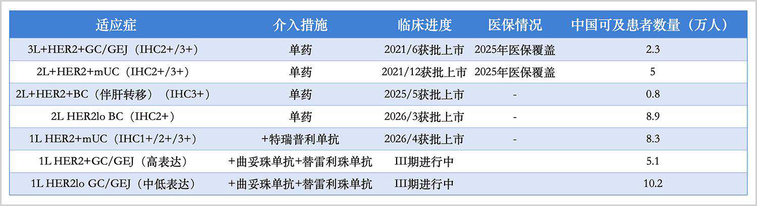RC48已获批后线胃癌、尿路上皮癌(二线)、HER2阳性晚期乳腺伴肝转移、HER2低表达乳腺癌伴肝转移、联合特瑞普利单抗一线治疗HER2表达的局部晚期或转移性尿路上皮癌,共五项适应症,前两个适应症获得医保覆盖。